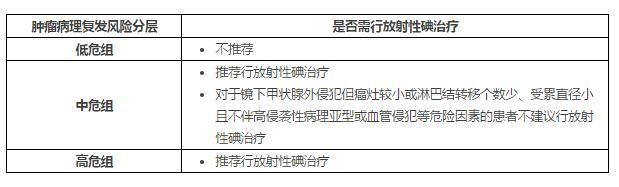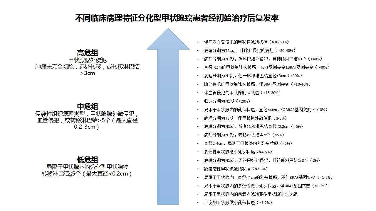 研究发现,分化型甲状腺癌术后复发风险性的高低跟肿瘤的病理类型、大小,有无肿瘤残留,有无淋巴结转移和血管侵犯等因素有关。据此,美国甲状腺协会(American Thyroid Association)根据甲状腺癌的术后病理特征、甲状腺球蛋白(Tg)水平以及放射性碘扫描将分化型甲状腺癌术后患者的复发风险分为低危、中危和高危组。