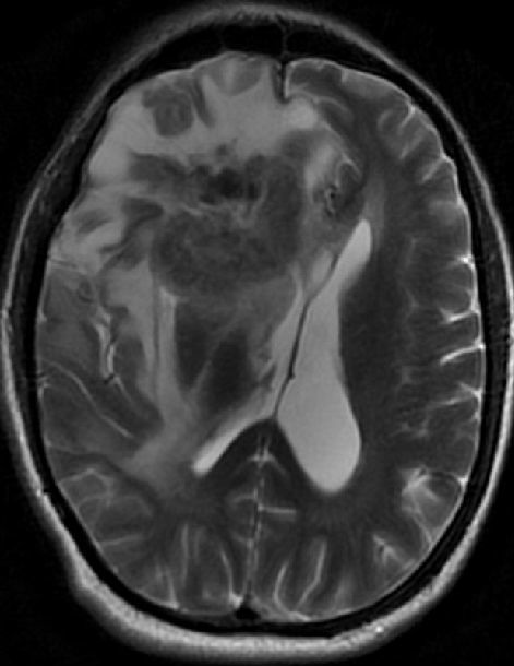 图 A:横断面 MRI T2 像显示右额叶可见一不均匀的病灶,病灶周围有血管性水肿。水肿压迫了同侧的侧脑室,中线向左偏移;