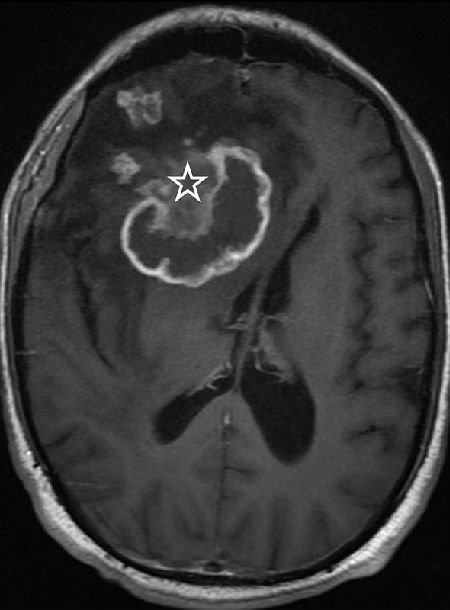 图 B:横断面 MRI T1 像对比增强显示肿块有环状的强化,同时在病变的前部有不均匀强化(图中星号所示),另外还可看到数个散在的点状增强