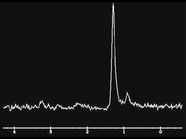 图 D:MRS 只看到一个脂质 - 乳酸峰,未见其它峰。