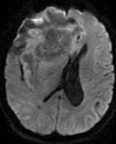 2. 影像学可以根据干酪样坏死的程度有不同的表现,在典型的神经系统结核瘤,干酪样坏死物不会引起任何扩散受限;