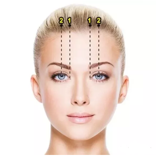 在帽状腱膜处注射肉毒毒素,可以起到很好的提升发际线的作用。注射点位如上图所示。注射点位于发际线内测1.5cm处,与眼角和瞳孔中线垂直。注射剂量为3-4U/注射点位