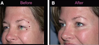 眉侧下垂部分是由眼轮匝肌向下过度牵拉引起的。眼轮匝肌外侧部肌肉的放松可使眉毛尾部升高。一种简单的眉侧抬高技术是将1-3个单位的肉毒毒素单点注射到眼眶上外侧,使其力量减弱。