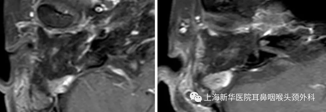 简要病史:患者右耳听力下降50余年,未予重视。10年前起出现右侧口角歪斜,当地医院予以针灸等保守治疗后可好转,但反复发作。1月前出现右耳流脓,当地医院就诊,诊断为“面神经瘤”。