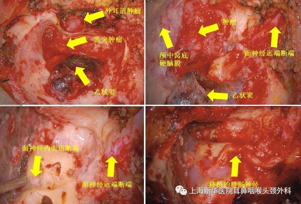 右耳后弧形切口向下延伸,暴露腮腺。向前掀起肌骨膜瓣后,切断外耳道,见外耳道内新生物。乳突轮廓化,磨除外耳道后壁,见乳突腔、鼓室内肿瘤组织,向上方侵蚀颅中窝底骨质,未突破硬脑膜。取部分肿瘤组织送冰冻,提示“神经鞘瘤”。磨开面神经垂直段骨管,打开茎乳孔,暴露面神经颞骨外段总干,在茎乳孔处面神经外观正常,遂在此处切断。切取断端面神经送冰冻,提示“未见肿瘤累及”。沿面神经走行向上磨除骨质暴露肿瘤,切除迷路,可见面神经垂直段、水平段、膝状神经节、迷路段全程受累,主体部分在膝状神经节。磨除迷路骨质,暴露并打开内听道,见面神经内听道段正常。彻底切除肿瘤组织,并剥离颅中窝及颅后窝硬脑膜表面的肿瘤。