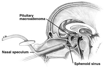 经单鼻孔入路显微手术切除垂体瘤。示意图