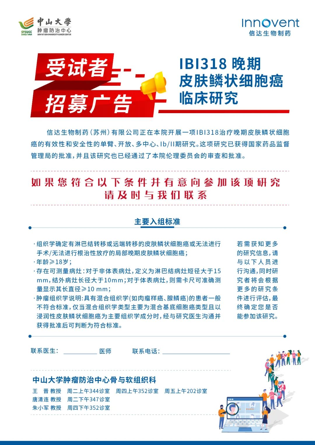 针对疾病:晚期皮肤鳞状细胞癌入组年龄:≥ 18 周岁入组性别:不限医药公司:信达生物制药(苏州)有限公司药物名称:重组全人源抗程序性双特异性抗体(IBI318)本试验中涉及的药物IBI318是针对PD-1及TAA的另一未披露靶点的重组全人源IgG1双特异性抗体,已于近期获得药物临床试验批件。该药物通过同时阻断PD-1及另一肿瘤相关靶点的信号通路,增强免疫突触的形成,从而有望提高抗肿瘤活性及疗效。