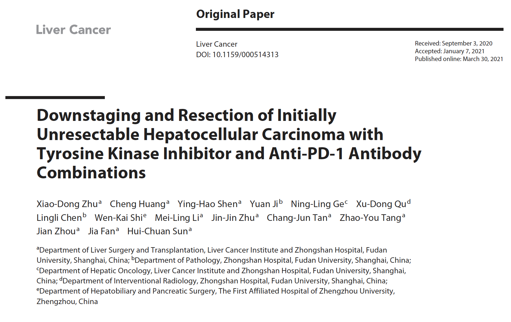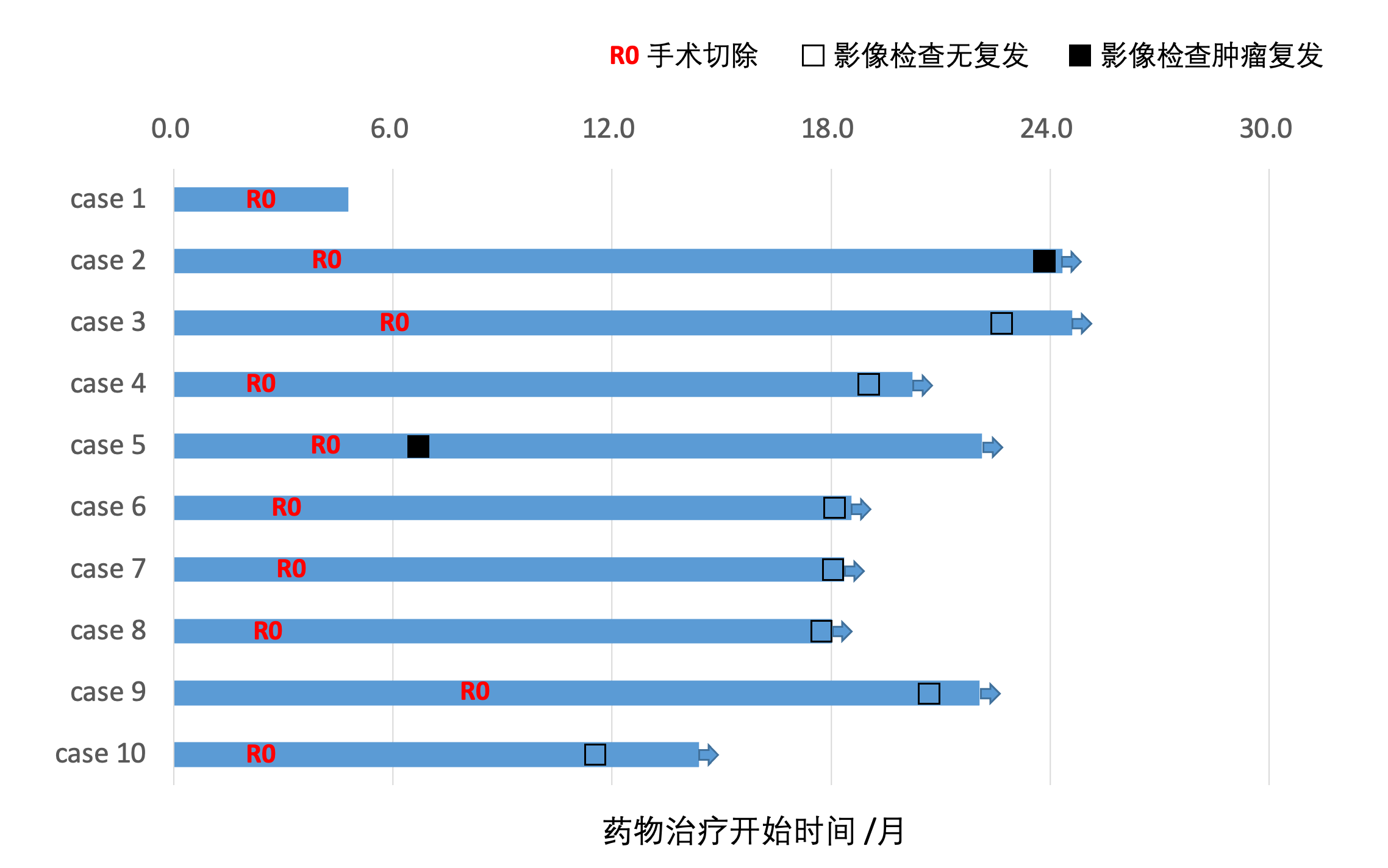 我们将这最初的 10 例患者的经验总结成了一篇论文,发表在 Liver Cancer 杂志上,本人是论文的第一作者,黄成和沈英皓副主任医师是共同第一作者。在这之前,累积到 9 例患者时曾在 2020 年的 ASCO 年会上发表了一个摘要。在国际上,这项研究是首次报道的相对较大病例量的药物治疗后转化切除的案例。在文章被接受之后,截止了今年 3 月初,这 10 例患者手术后时间都超过了 1 年,新增了 1 例复发病例。这些患者在手术之后继续用药一段时间后,因为肿瘤未见复发,其中 6 例患者已经停止抗肿瘤治疗,获得了无异于常人的生活质量。对于一开始不能做手术切除的切除肝癌患者,高质量的无瘤生存的的机会非常可贵。