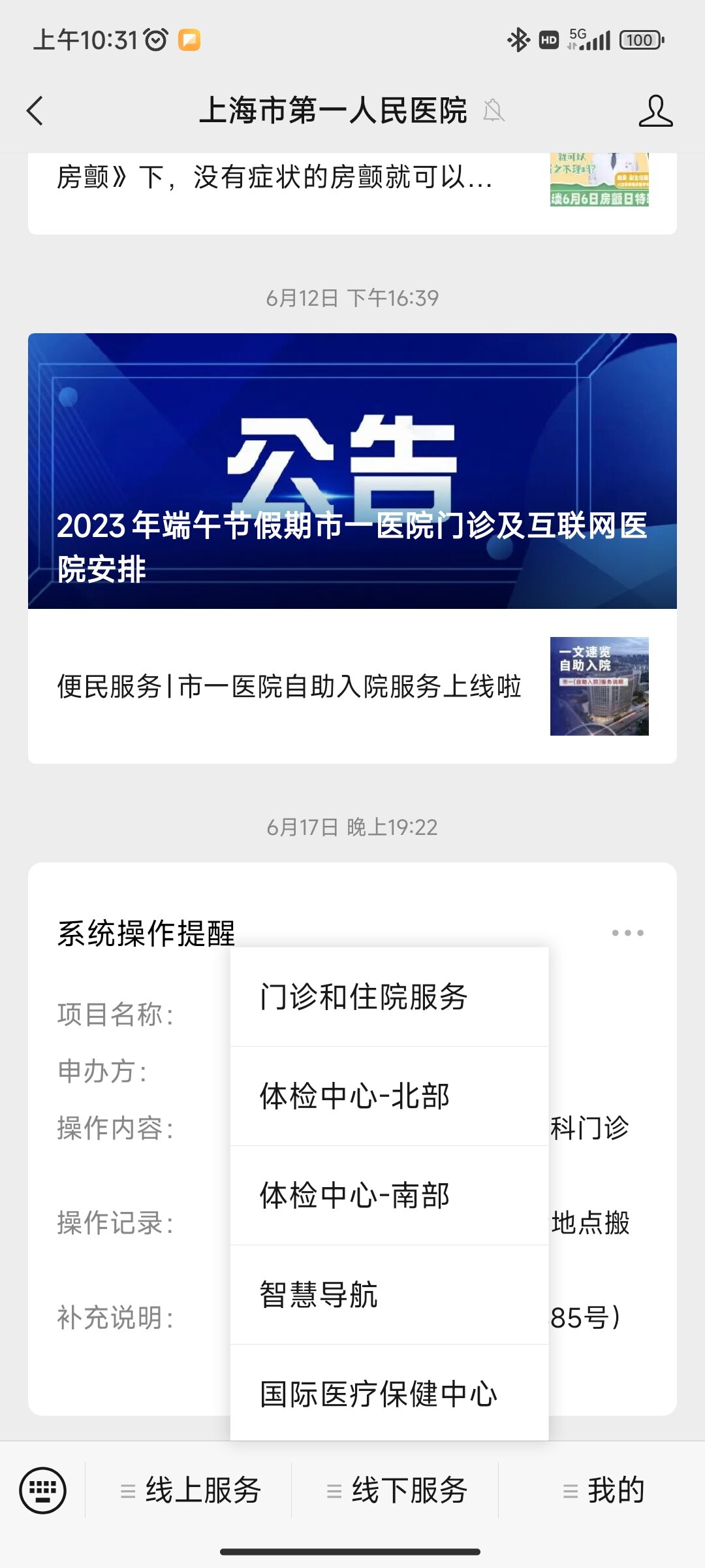第二步:关注公众号,选择下方“线下服务”—“门诊和住院服务”