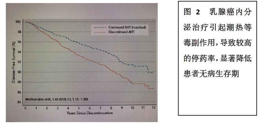 首先,第一点:要加强宣教,确保治疗足程落实。临床医生要高度关注药物副作用和由此引起的停药问题。我们知道,内分泌药物通常是口服的,患者一般居家服用。因此,在出现副作用时,患者并不一定及时地与主管医生沟通,许多患者往往存在自行停药的现象。这就要求医生要充分了解并做好临床宣教,让患者认识到内分泌治疗的充分落实对于改善预后具有重要意义,从而增加依从性。