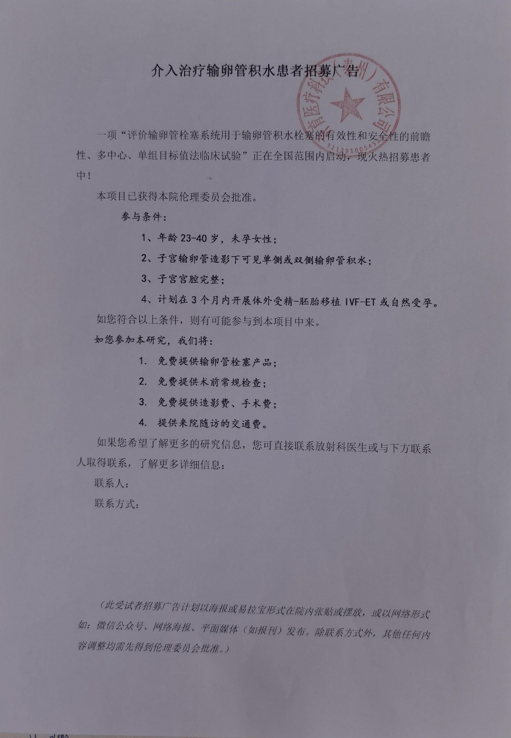 目前我院输卵管介入栓塞临床研究患者持续招募中,若有意愿可来门诊或者线上联系我咨询。根据检验结果,若满足所有入组标准且没有一项排除标准,则可入组参与临床研究。