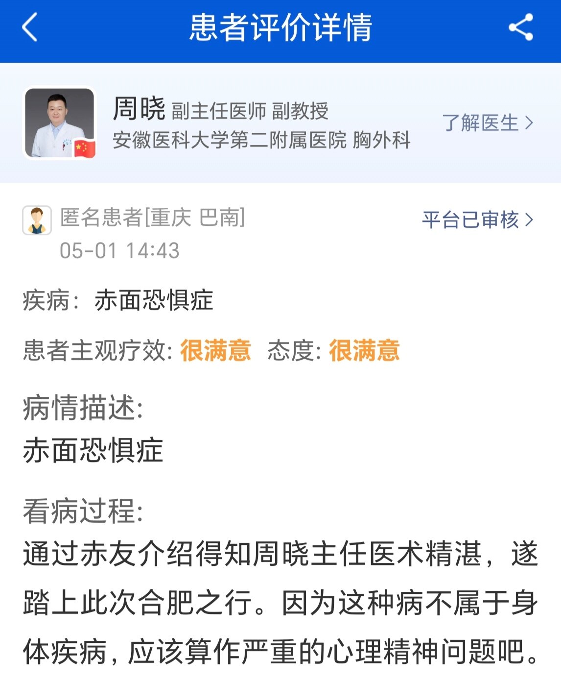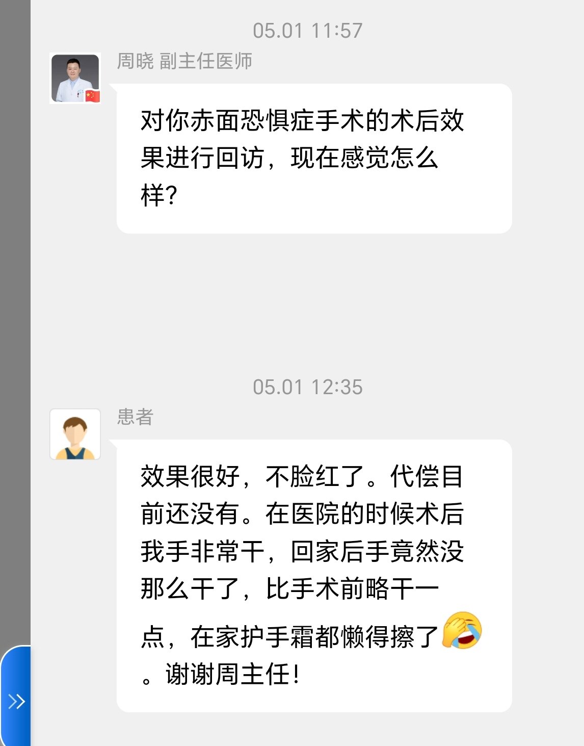 因为这种病不属于身体疾病,应该算作严重的心理精神问题吧。于是这次就医之行心里是忐忑和焦虑的,害怕医护和医院其它病患对我们这种心理患者审视的异样目光,于是第一次面诊,我们几个赤面全戴着口罩坐在会议室,小心翼翼的躲在口罩后面维护着自己敏感,易碎的自尊心。一会周主任大踏步,活力满满的进来了。扫视了我们一圈,每个人的微表情反馈给了周主任我们几个初步的病情。一个由于过度紧张而面带惊恐的小男生立即被周主任发现了他的异样。周主任笑着开玩笑说,你戴着口罩也掩饰不了你的紧张,别怕,在医生面前你不用怕,因为周主任看着和蔼可亲,目光温柔。我反倒没有了平时的那种紧张恐惧感,随即周主任向我们详细介绍了赤面的成因,手术概要,术后后遗症。由于此项手术的特殊性,本着对我们绝对负责任的态度,周主任着重阐述了此项手术的成功率和后遗症,阐明利害关系。不想因为我们对这项手术的一知半解从而做出错误的决定。一再强调如果不是很影响生活和工作就不要做。最后请求我们慎重考虑,随时可以反悔。最后我们几个因为赤面严重影响生活,执意请求手术。周主任无奈的笑着摇摇头说,你们啊,为什么要进行这样的置换呢,现在是脸红的痛苦,术后就是后遗症的痛苦了,好吧,明天手术,今晚你们再好好考虑一下。第二天上午,周主任再次召集我们开会,再次阐明手术的利害关系,然后我们签字等待手术。周主任很辛苦,因为慕名而来的很多,当天就安排了五台手术。周主任从早上一直到晚上7点多才结束所有手术。在我手术的时候,护士在做准备工作,周主任为了缓解我的紧张感,就随意的和我聊天,主任的风趣幽默一会就让我放松下来。准备工作就绪。只听周主任说那我们开始了,一只面罩就罩在我脸上,几秒后失去了知觉。手术第二天早上,我还在吃早饭,周主任就来查房了,询问我们的术后情况。随和的和我们聊天。我早已没有来之前的紧张不安,也轻松的参与聊天。随后办理了出院手术,合肥之行顺利结束!