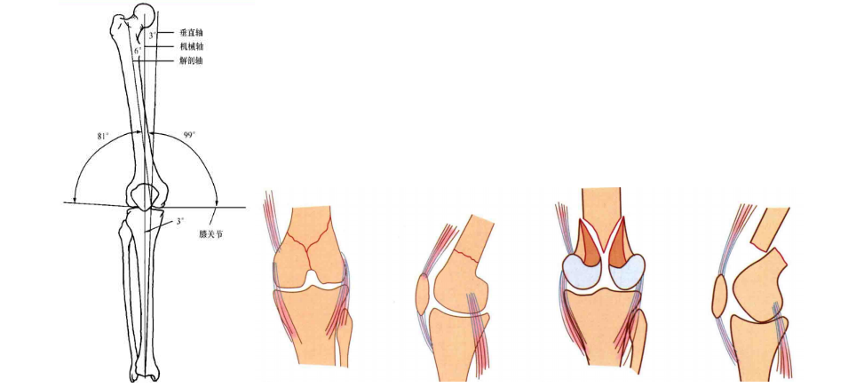 下肢正常的机械轴和解剖轴,正确重建下肢的力线。股骨的机械轴从股骨头的中心到膝关节的中心,和垂直线有3°的成角。股骨的机械轴延伸至踝关节中心,即为整个下肢的机械轴。与股骨的机械轴不同,解剖轴在膝关节处有9°的外翻角,因此在股骨远端,外侧解剖轴与水平轴夹角为81°,内侧夹角为99°。胫骨的解剖轴和机械轴一致,均为膝关节中点和踝关节中点的连线。股骨远端骨折,腓肠肌收缩,可造成股骨远端向后倾倒,股骨髁的旋转畸形;股四头肌收缩,可导致骨折短缩畸形;大收肌收缩有可能造成骨折远端的旋转畸形;