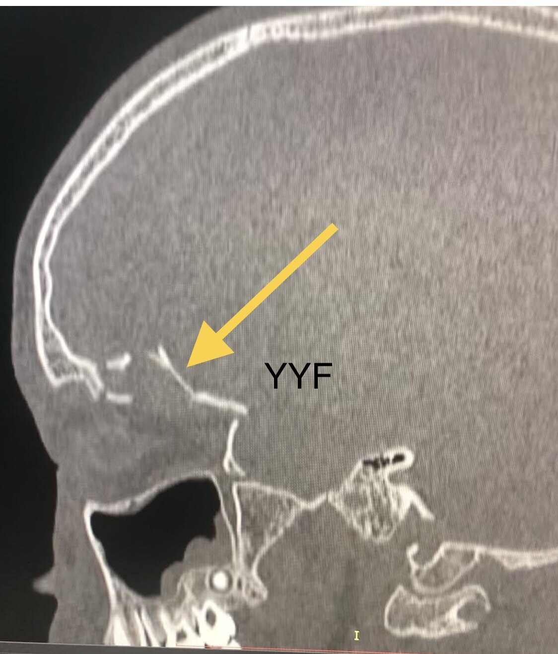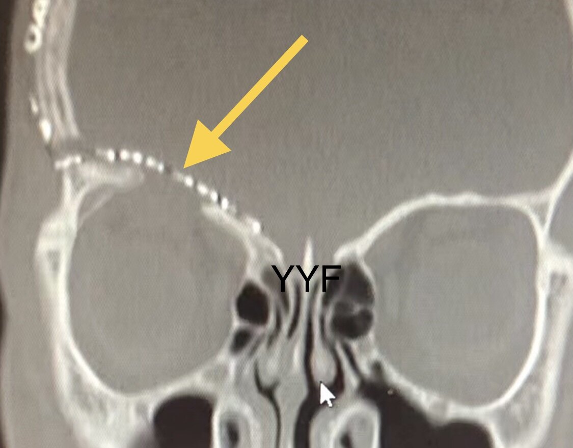 CT检查发现眶顶(相当于2楼“房顶”如果把眼眶比作2楼的房间),也就是颅底(3楼的“地板”)有明显的大范围骨折: