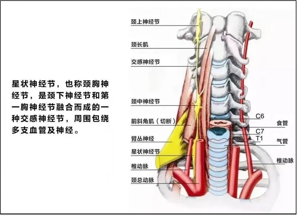 星状神经节由下颈部交感神经节和第一胸交感神经节融合而成。因其外形酷似星星,故被称作星状神经节。星状神经节其实就是一个自动神经内分泌交通枢纽,它不受大脑意识的支配,自行控制血管神经功能,通过对它的干预,对全身各个地方的神经血管内分泌网络都能起到一定调节作用。