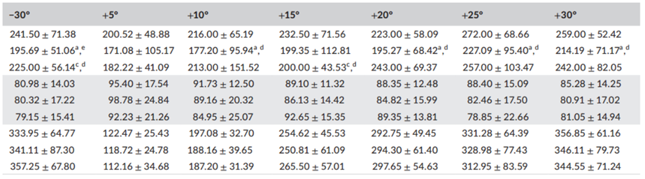 比较不同组间反射性扫视的潜伏期、准确度和各角度速度。PD 患者在 +10°、−15°、±20°、±25° 和 ±30° 位置的缩短潜伏期与健康对照组相比有显著差异(p < .05;表 3)。17 名 PD 患者(17/96,17.7%)和 8 名 MSA 患者(8/33,24.2%)出现扫视侵入,高于健康对照组(3/40,7.5%)(p > .05;表 2)。