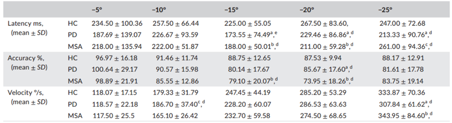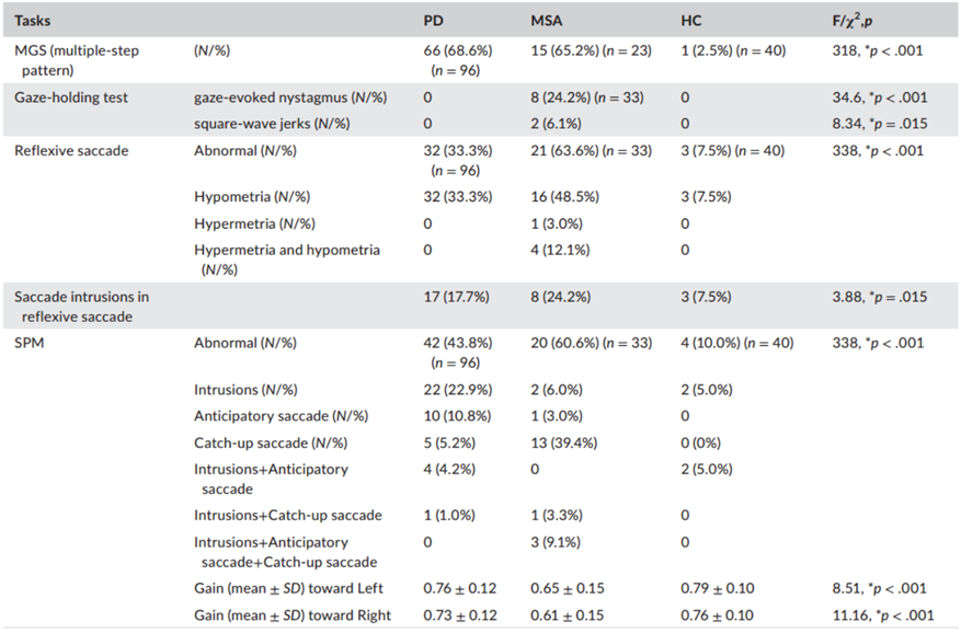 与PD患者和健康对照者相比,仅MSA患者有异常的凝视诱发眼球震颤(8/33,24.2%)和方波抽搐(2/s,2/33,6.1%)(p<.05),所有受试者均未发现宏观方波抽搐(表2)。