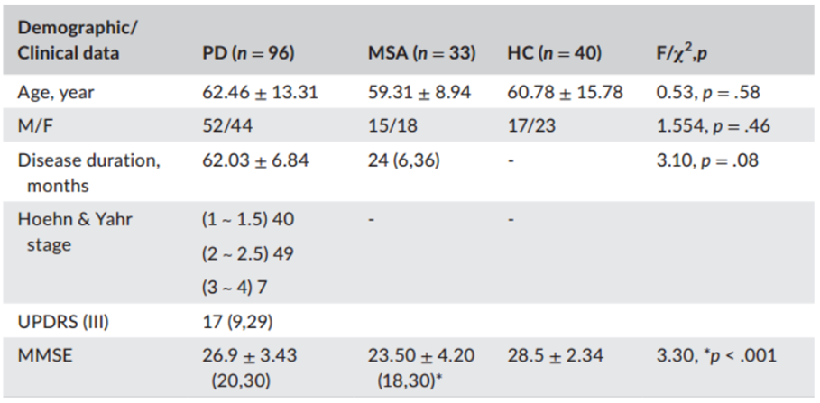缩写:F,女性;HC,健康对照者;M,男性;MMSE,最低限度精神状态检查;MSA,多系统萎缩;PD,帕金森病;UPDRS,统一帕金森病评定量表。*p< .05