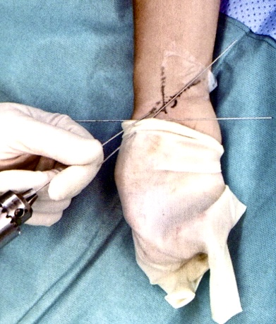 2)鼻烟窝处做小切口,自远端向近端,向尺骨茎突方向打人导针,