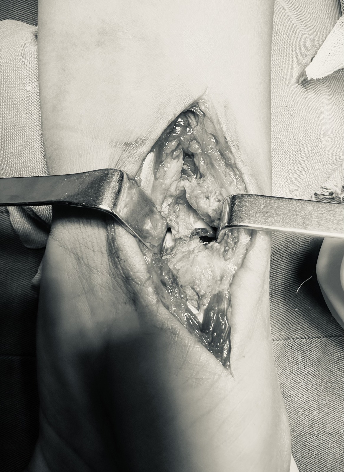 4)找到舟大多角关节,插入剥离子,显露舟骨远极,在舟骨远极关节囊切口的远端横向切开关节囊。(舟骨腰部位于桡侧腕屈肌腱和近侧腕横纹的交叉处)。