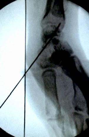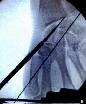1)臂丛麻醉 ,于体表鼻烟窝处触摸舟骨,并用克氏针标记进针方向,透视后调整。
