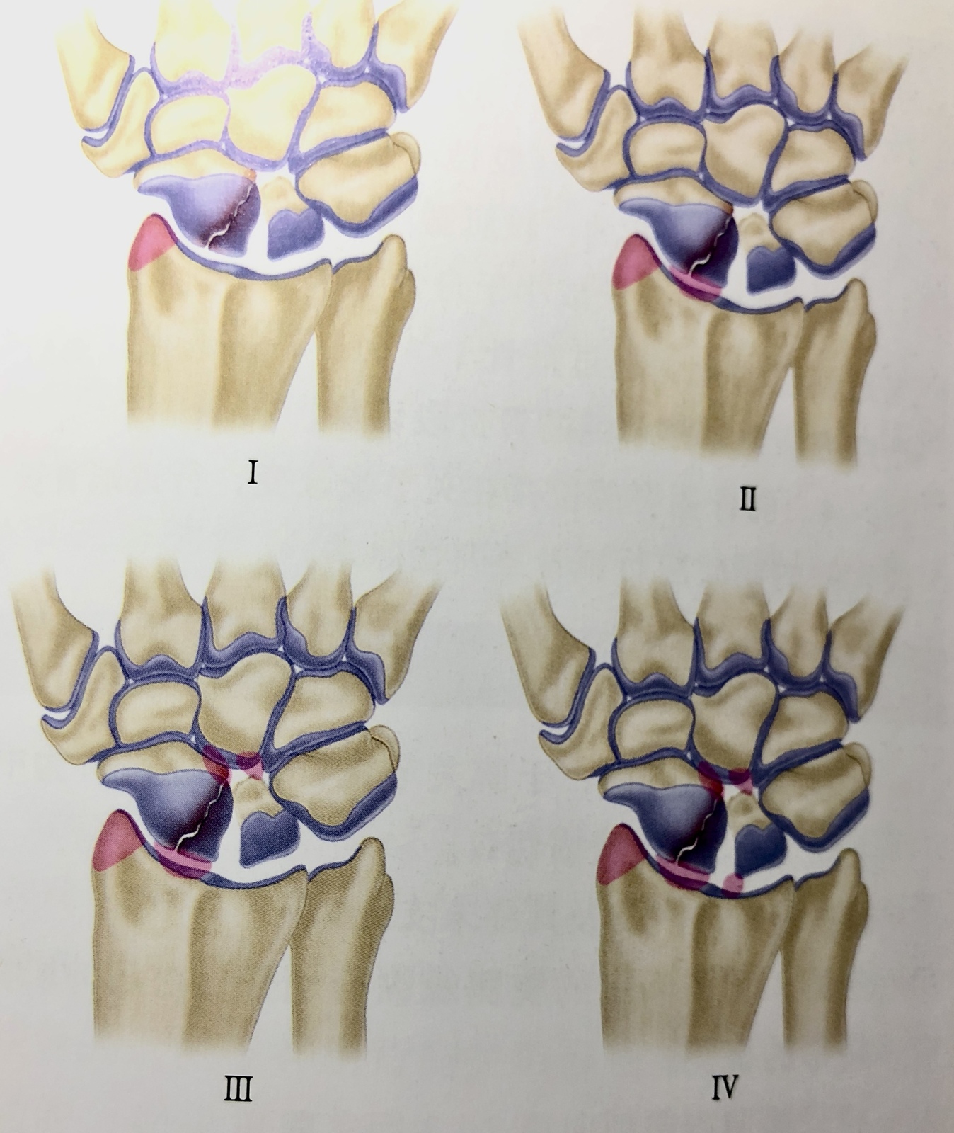 舟骨骨折不愈合进行性塌陷分期: 1期:桡骨茎突关节炎; 2期:舟状窝关节炎; 3期:头月关节炎; 4期:广泛腕关节炎;